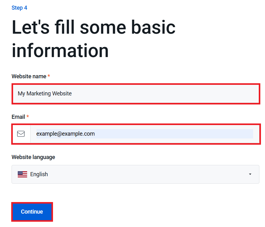 5. In the next step, enter your Website name* and Email* address, select your Website language and click on Continue.