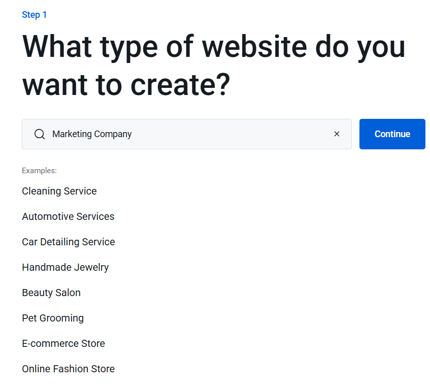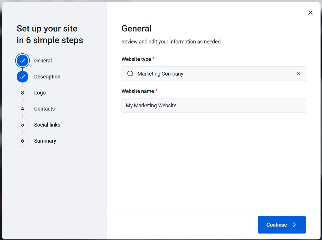 3. If this is the first time you are accessing your Website Builder, you will be prompted to select the type of website that you want to build. Click on Continue once selected.
