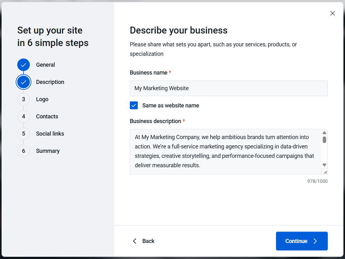 Note that the more detailed your business description is, the more personalized the website content will be. -