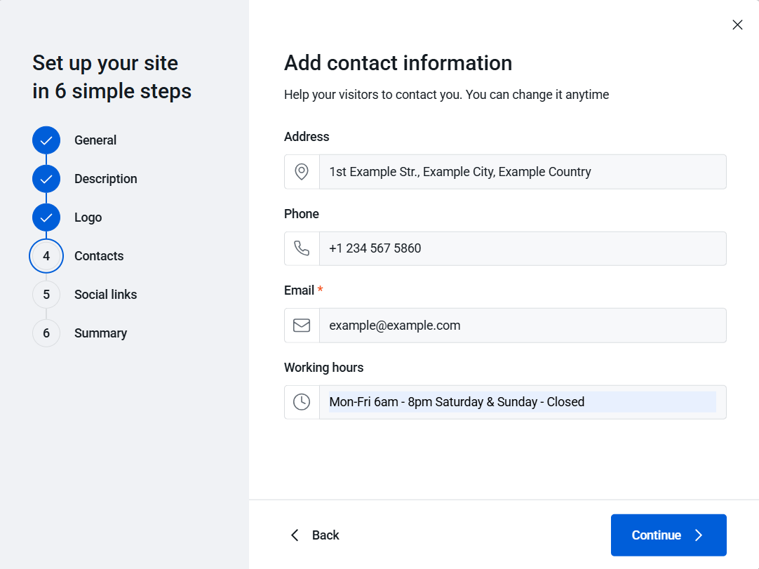 d) Contacts - Enter your Address, Phone, Email * and Working hours. Note that not all fields are mandatory, but it will help personalize your website if you provide more information here.