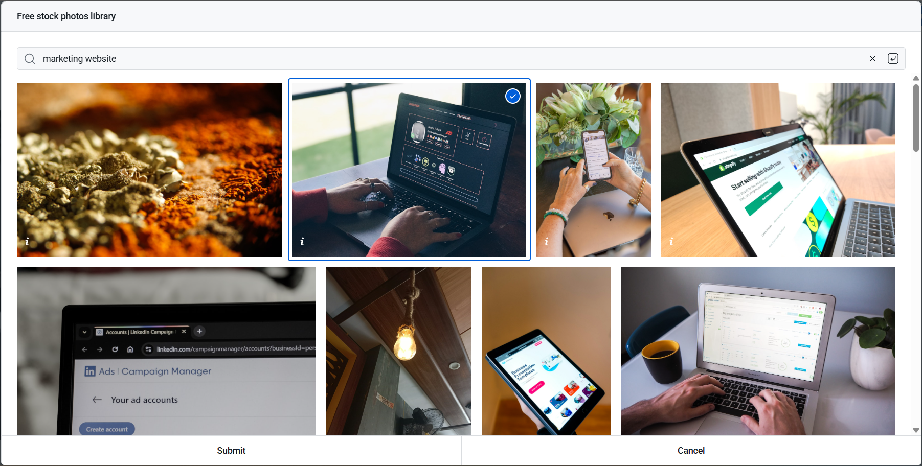 Choose to Upload a file... from your local storage or Browse free stock photos...