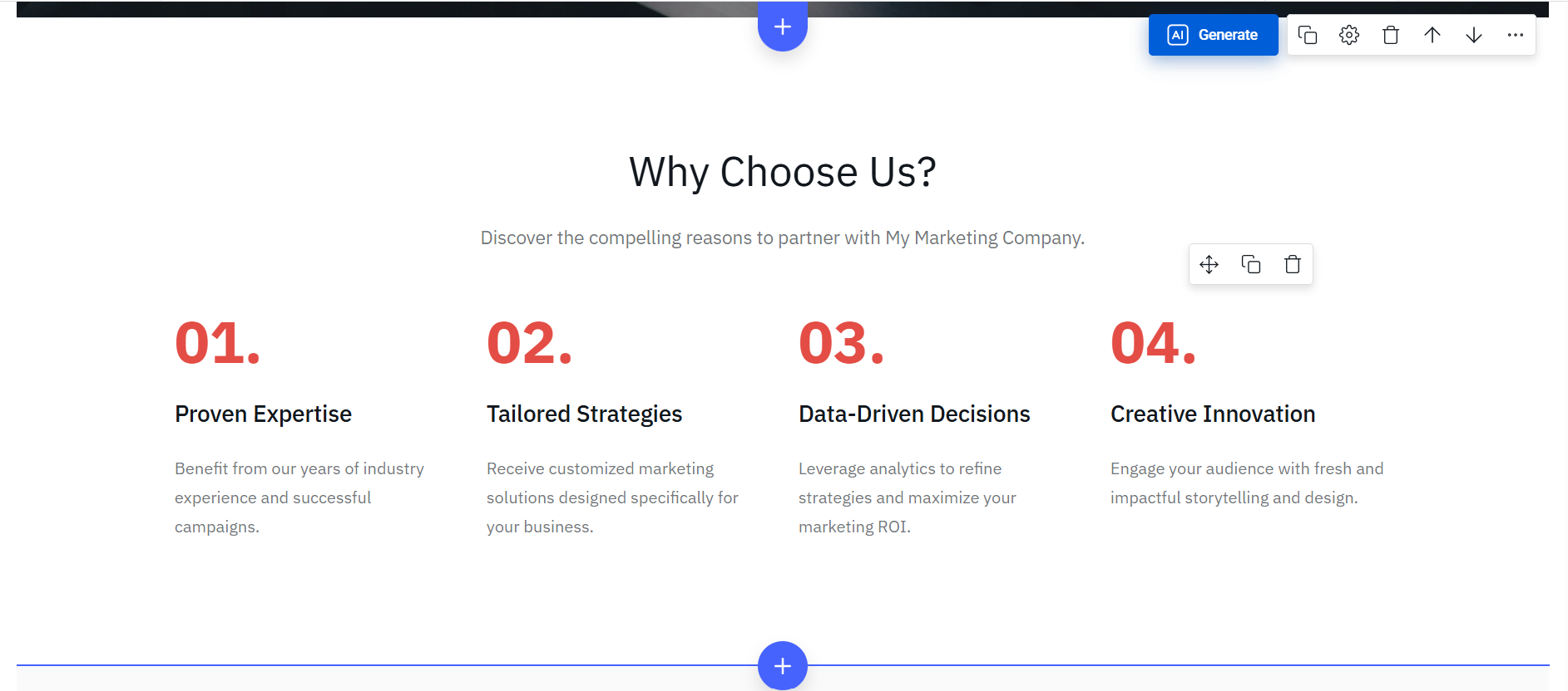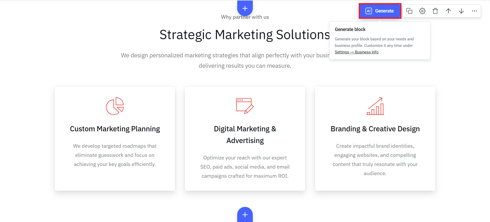 10. There is an option to AI Generate any block on the website. To do that, hover over the block and click on the AI Generate button.