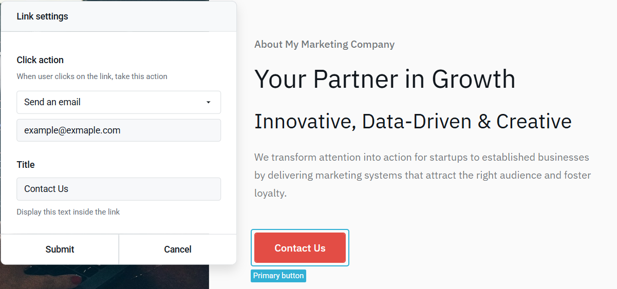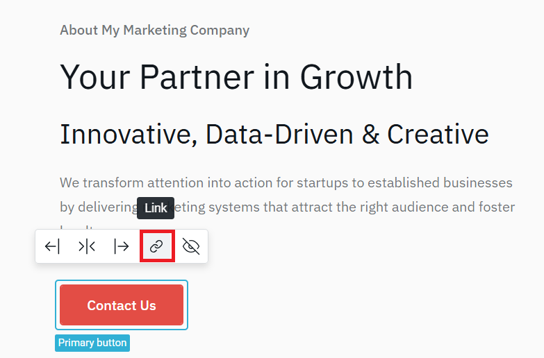 Some of the pages generated might contain CTA buttons, which is best practice to be customized to your needs. To do that, locate the CTA button and click on it. Select the Link option to customize it.
