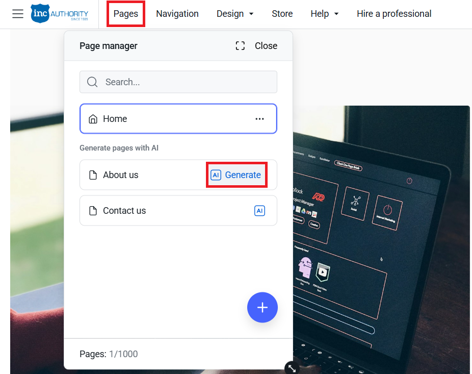 About us & Contact us pages can be AI-generated from within this menu.