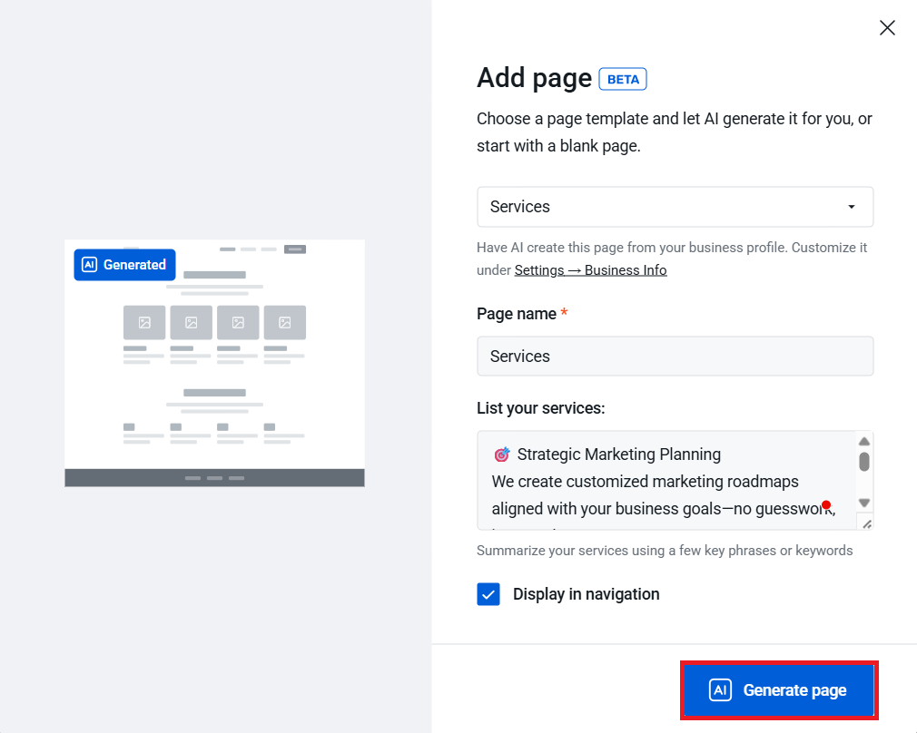 - The AI wizard simplifies creating website content, generates a website structure, layout, text, and images based on the business information, and allows adding more pages as needed.