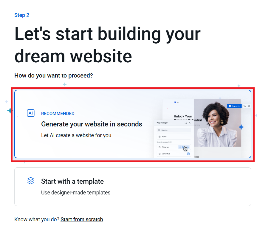 4. Choose how you want to build your website. To use the AI generator, select the first recommended option.