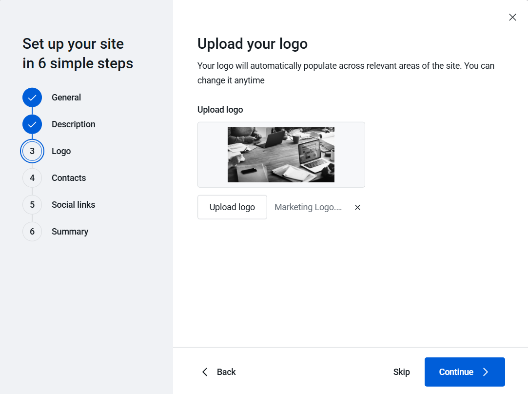 c) Logo - Click the Upload logo button and select a file from your local computer.