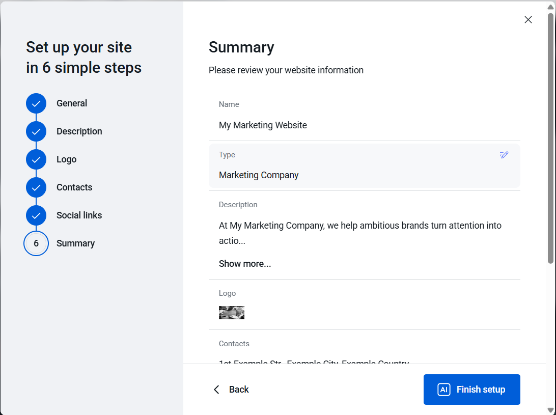 f) Summary - review all the information entered in the previous steps. If no changes are needed, click on the AI Finish setup. The AI Wizard starts generating your website based on all the information provided in the previous steps.