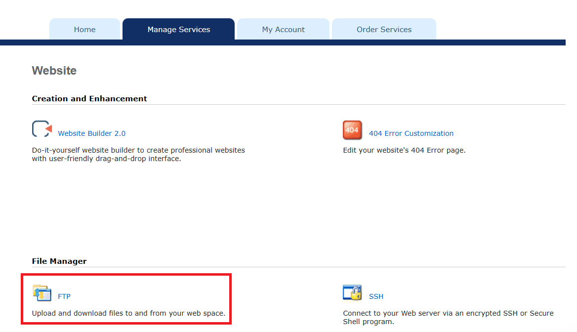 2.1: Alternatively, you can access the FTP Overview through the Website page. Under Manage Services, click Website. On the Website page, click FTP in the File Manager section.