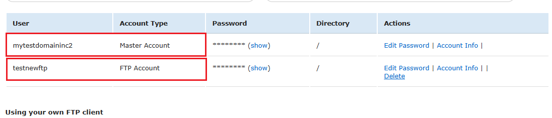 There are three types of FTP accounts – Master FTP Account, Additional FTP Account and Subdirectory (Subdir) FTP account. The difference between them is in the level of access with the Master FTP account having the highest level of access.
