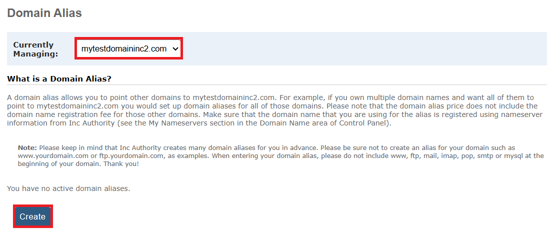 5. The Domain Alias Summary page displays any existing domain name aliases that have already been set up for your domain (If any)