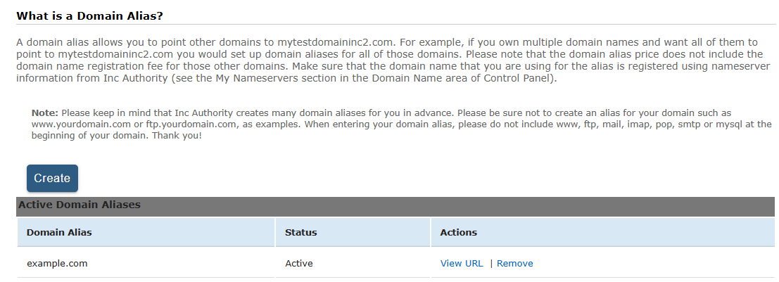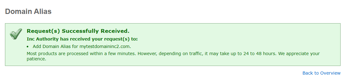 10. Your new domain name alias will appear on the Domain Name Alias summary page.