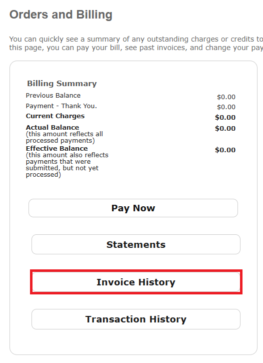 4. On the Orders and Billing page, click the Invoice History button located in the Billing Summary subsection.