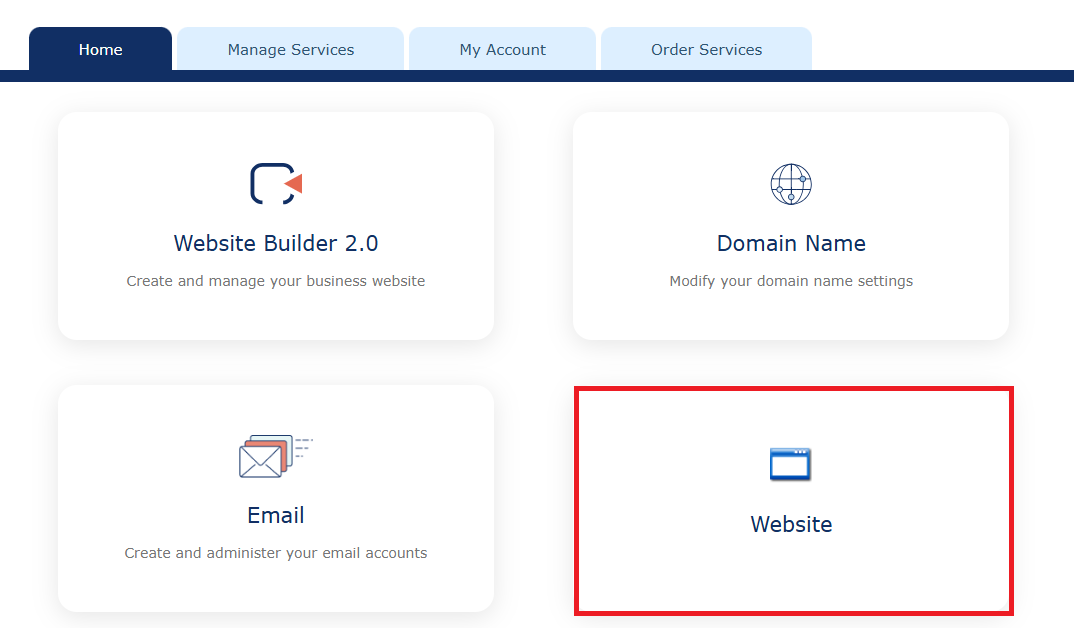 2.1: Alternatively, you can access the FTP Overview through the Website page. Under Manage Services, click Website. On the Website page, click FTP in the File Manager section.