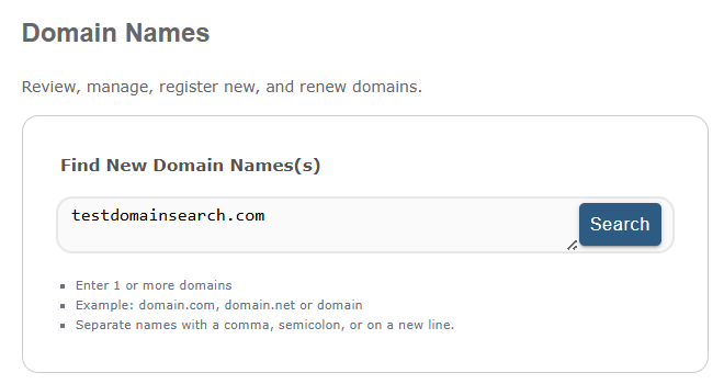 3. Type the desired domain name in the Find New Domain Name (s) box and check if it is available for registration by clicking on Search.