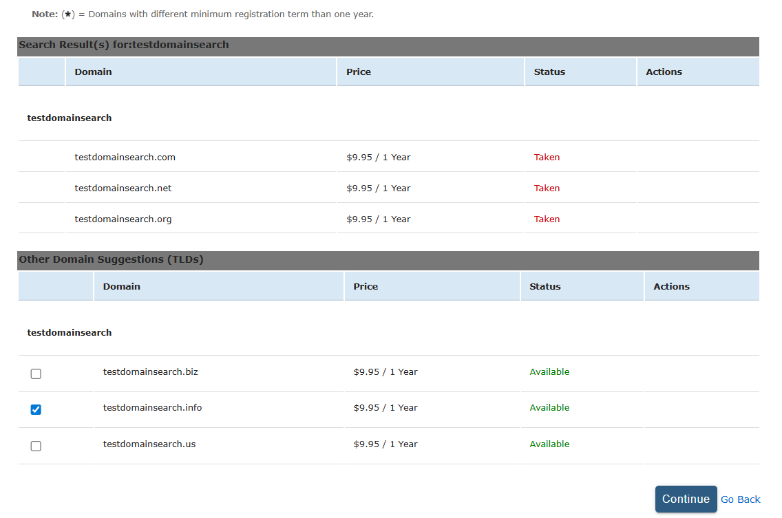 4. On the next page, you will see a list of suggested domain names and their corresponding price. If your domain name is available, you will be able to check the box on its left side. That will mark it and you will be able to click on Continue. If the domain name that you searched for is not available, you will be able to choose from a list of similar domain names.