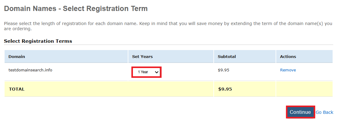5. After that, you will have to choose the term for which you want to register the domain name in years. From the Set Years drop-down menu, you can select a term of 1 to 9 years. Then, click on Continue.