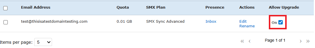 4. From the Email Addresses list, locate the mailbox you wish to allow the upgrades for and click on the right side button under Allow Upgrade - On/Off.