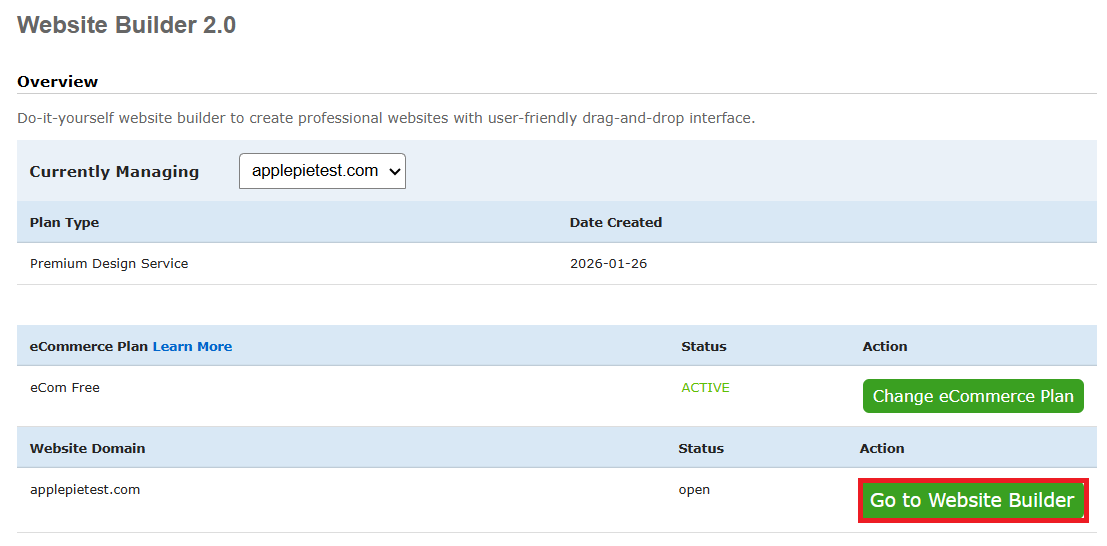 You will be redirected to the Website Builder 2.0 Overview page, where you can click on the Go To Website Builder button to access the interface.