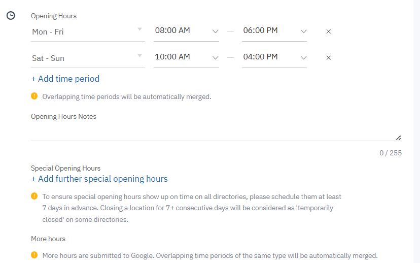 Opening Hours - Edit your Business location opening hours.