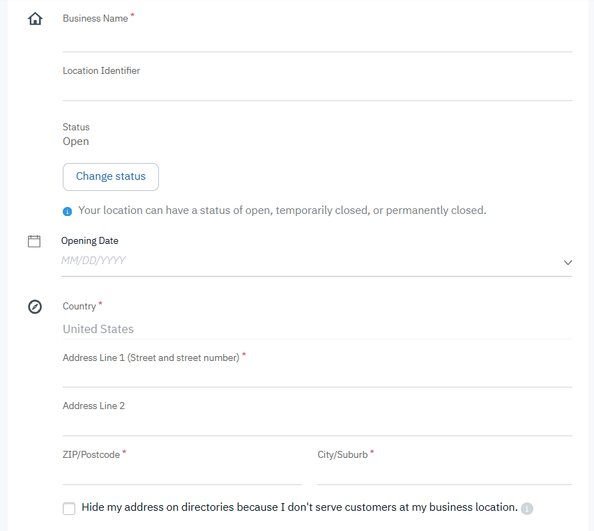 - Hide my address on directories because I don't serve customers at my business location - If you check this box, your exact address will be hidden on the online directories.
